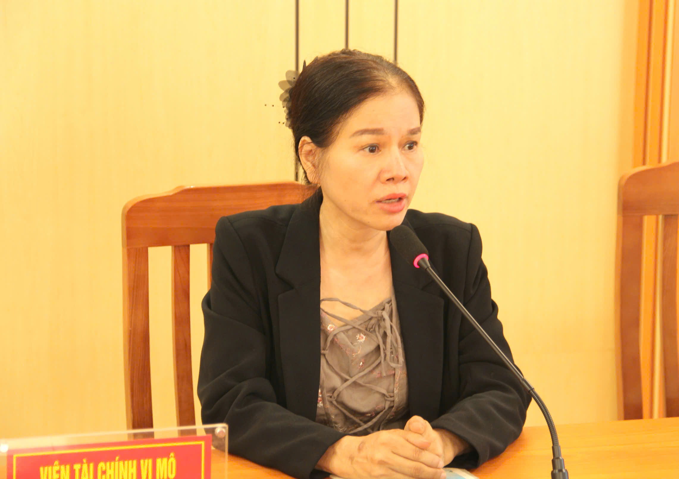 Đồng chí Đinh Thị Minh Thái - Viện trưởng Viện Tài chính vi mô và Phát triển cộng đồng phát biểu tại hội nghị