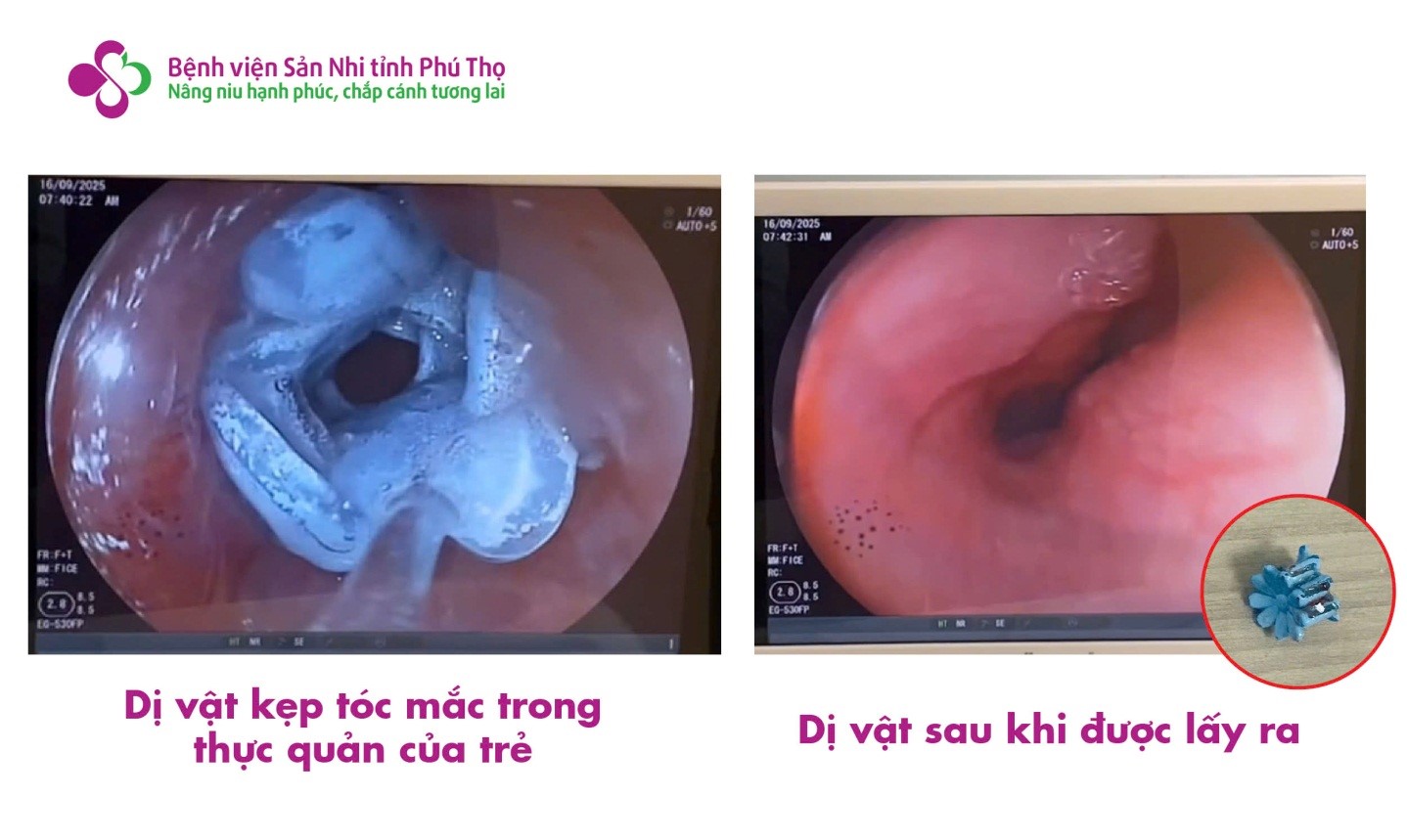 Trước đó, bệnh nhi N.M.A (5 tuổi, trú tại xã Phú Mỹ, tỉnh Phú Thọ) được đưa vào viện trong tình trạng đau rát họng. Theo lời kể của gia đình, khoảng một giờ trước khi nhập viện, trẻ chơi ở lớp, ngậm kẹp tóc rồi vô tình nuốt phải. Tại cơ sở y tế gần nhất, hình ảnh dị vật được phát hiện, sau đó trẻ nhanh chóng được chuyển đến Bệnh viện Sản Nhi tỉnh Phú Thọ để điều trị.