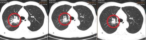 Sau chu kỳ điều trị đầu tiên, người bệnh có nhiều cải thiện lâm sàng, hết đau, không khó thở và không phải dùng đến thuốc giảm đau. Quá trình điều trị, người bệnh đáp ứng với thuốc tốt, hệ miễn dịch cơ thể tăng, người bệnh trở lại sinh hoạt gần như bình thường. Tiếp tục điều trị các chu kỳ tiếp theo, người bệnh dung nạp thuốc tốt và không gặp phải độc tính, tác dụng phụ của thuốc. Kết quả CT phổi cho thấy khối u phổi đã giảm kích thước đáng kể.